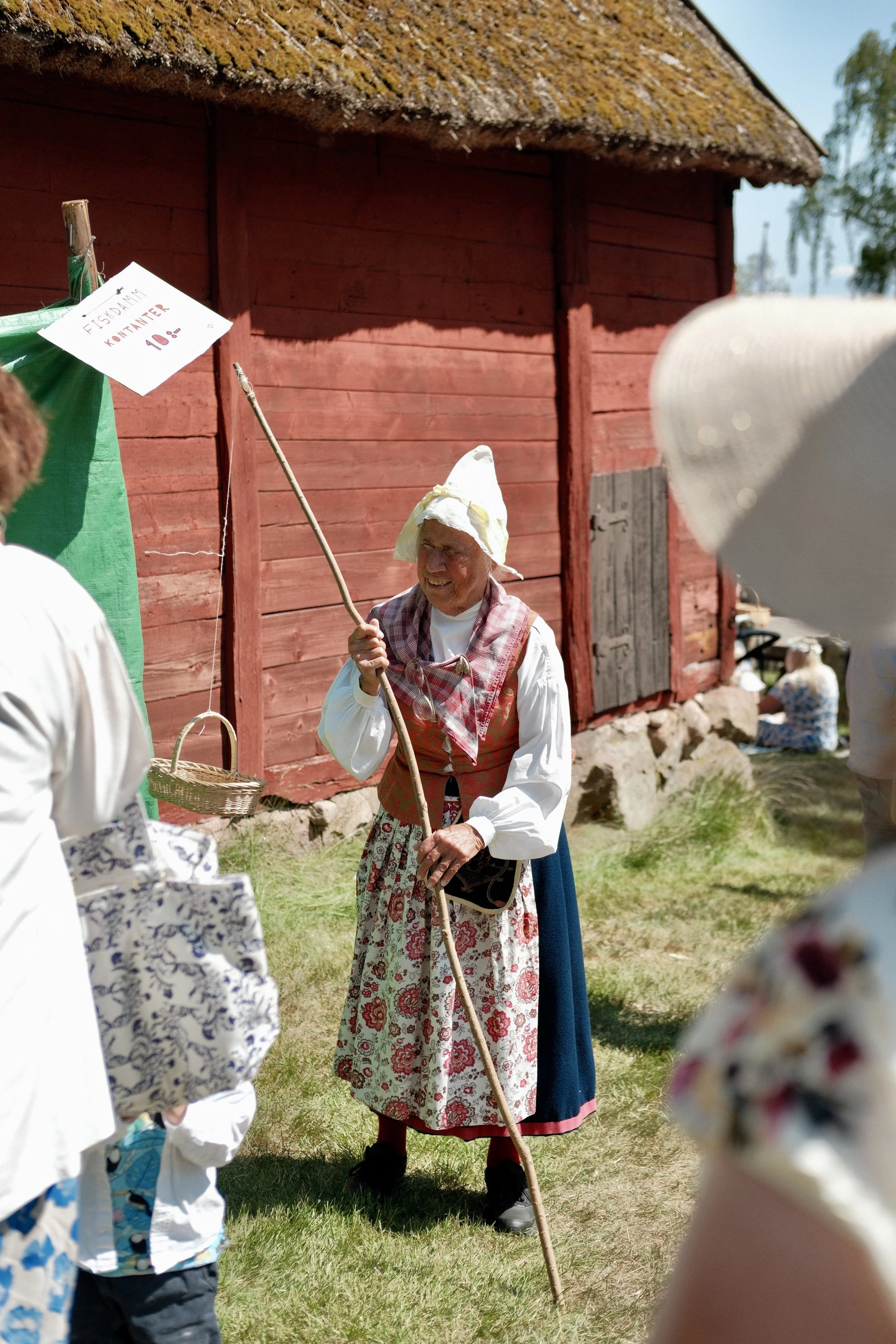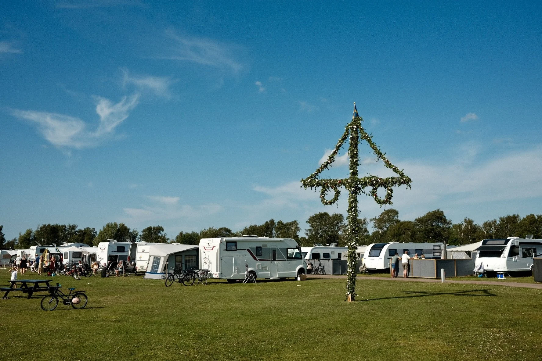Wir fahren die letzten Kilometer entlang der Westküste Schwedens bis Halmstad. Dabei haben wir noch einmal richtig viel Wind, aber glücklicherweise Rückenwind. Wir fahren nun durch eine Gegend die mehr Landwirtschaftsbetriebe hat und deshalb auch viele schöne Hofläden, sowie Erdbeerfelder zum selber pflücken, was viele Schwed:innen zu Midsommar machen. Dieses Jahr sei aber kein Erdbeerjahr erfahren wir. Wir drei merken davon nicht viel und haben auf unserer Velotour wohl so viele Erdbeeren wie noch nie gegessen. Wir scheinen der Erdbeersaison nachzufahren, da passt Ronjas grosse Leidenschaft für diese Frucht und ihr Erdbeervelohelm perfekt dazu. Auf den Campingplätzen gibts zu Ronjas grosser Freude immer mehr Kinder, da in Schweden die Sommerferien angefangen haben. Besonders geniesst sie das hüpfen auf riesigen Trampolins. Uns gefallen die oft menschenleeren Strände. In Halmstad bleiben wir drei Tage. Ein Tag gehen wir ausgiebig shoppen in dem sehr süssen Städtchen. Wir besorgen uns ein Midsommar-Outfit u.a. im schwedischen Outdoorgeschäft Naturkompaniet. Am Mittag essen wir eine leckere Pizza. Zur Pizza gibts hier in Schweden immer einen sogenannten Pizzasalat. Es ist ein Weisschabis-Salat mit Vinaigrette. Und dann ist der grosse Tag gekommen - Midsommar! Wir gehen in ein Restaurant in Halmstad um das klassische Midsommarmenu zu essen. Es gibt verschiedene Sorten Hering, Lachs, Krabben, gekochte Eier, Jungkartoffeln, Randensalat und Knäckebrot. Und zum Nachtisch Erdbeeren mit Rahm, Vanilleis oder in Form einer Erdbeertorte. Danach besuchen wir im Freilichtmuseum das traditionelle Fest. Ein Maibaum wird gemeinsam zu Volksmusik mit Blumen und grünen Ästen geschmückt. Frauen in klassicher Tracht nehmen die Blumen entgegen und befestigen sie mit Draht. Ronja ist voll motiviert dabei und sagt "Frou meh Blueme bringe". Dann strömen immer mehr Menschen auf den Platz und es gibt kaum Schatten. Wir schauen noch zu wie alle gemeinsam um den nun aufgerichteten Maibaum tanzen und kehren zum Camping zurück. Hier stellen wir fest, dass Midsommar vor allem im Kreis von Freunden und Familie mit viel Essen und Alkohol gefeiert wird. Viele machen dazu Spiele wie Kubb und Fünfkämpfe. Wir beginnen noch mit Packen, da es am nächsten Tag früh auf die Fähre nach Dänemark geht. Der Abschied von Schweden fällt uns schwer. Wir haben uns sehr in das Land verliebt und hätten gerne eine unserer Velotaschen mit Schweden gefüllt zum mitnehmen. Der Zufall will es, dass wir spät abends mit unserem Campingplatznachbaren ins Gespräch kommen und wir erfahren, dass er einer der drei Produktentwickler von Sia, der grössten und ältesten Glacéfirma in Schweden ist. Wir erzählen ihm, dass wir erstaunt waren über die Eisliebe der Schwed:innen zu jeder Tages- Nachtzeit und bei jedem Wetter isst hier jemand Eis. Wir selber lieben Eis und haben in dem Monat in Schweden so einige Siaglacées gegessen. Ronja wird vor allem die Pipi-Langstrumpfglace vermissen.